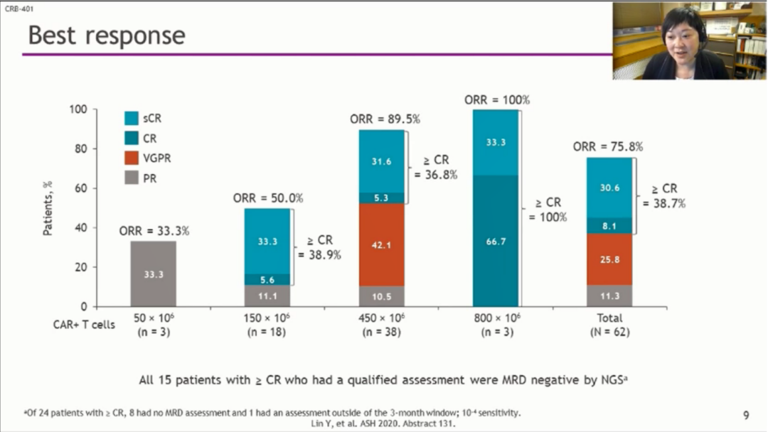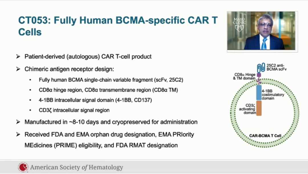 此外,Legend公司原创研发的CAR-T产品【6】cilta-cel也正在开展相关临床研究,纳入了超过100例患者,其客观缓解率(ORR)接近100%,并且获得了深度缓解,目前中位PFS尚未达到,但基于目前的研究数据而言,中位PFS将达到1.5年,即便是既往接受过平均6线以上治疗的患者,这同样是极具前景的疗效数据。此外,还有一些新型的CAR-T产品正在研发中,包括CARsgen公司研发的CT053,其机制与以往基于慢病毒技术的CAR-T不同,它能缓解慢病毒为载体带来的相关问题,CT053的新转运模式能使得长期随访的疗效更安全。
