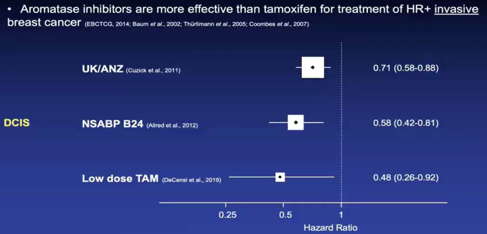 DCIS是浸润性乳腺癌的前兆肿瘤,虽然预后良好,但有发展成为浸润癌的可能,术后主要风险在于同侧及对侧乳腺癌的复发,而浸润癌的发生使远处转移风险增加。NSABP B-24和UK/ANZ两项经典的随机、双盲临床试验证实,DCIS患者局部手术后给予他莫昔芬辅助内分泌治疗使同侧乳腺癌复发及对侧乳腺癌新发风险进一步降低,尤其是ER阳性乳腺癌患者,已被NCCN指南作为Ⅰ类证据推荐为ER阳性DCIS的辅助治疗。