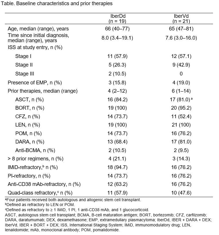 CC-220-MM-001是一项Ⅰ/Ⅱ期研究,是IBER在RRMM患者剂量递增试验;IBER + DEX队列显示了有利的安全性特征,具有良好的疗效,并且选定的IBER RP2D为1.6 mg 21/28天(D)。旨在研究IBER + Dara + DEX(IberDd)和IBER + BORT + DEX(IberVd)队列的结果。