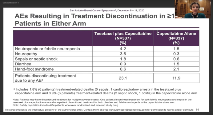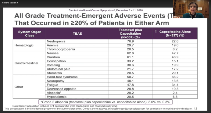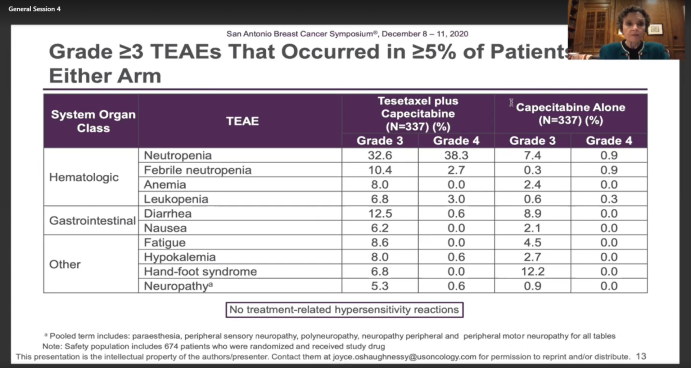 tesetaxel联合降低剂量的卡培他滨的全口服药物的治疗方案,与卡培他滨单药治疗相比,显著改善了PFS。≥3级最常见的毒副反应是中性粒细胞减少。脱发和神经毒性发生率较低。