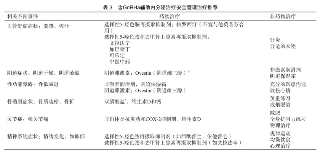 表1 含GnRHa辅助内分泌治疗安全管理治疗推荐1