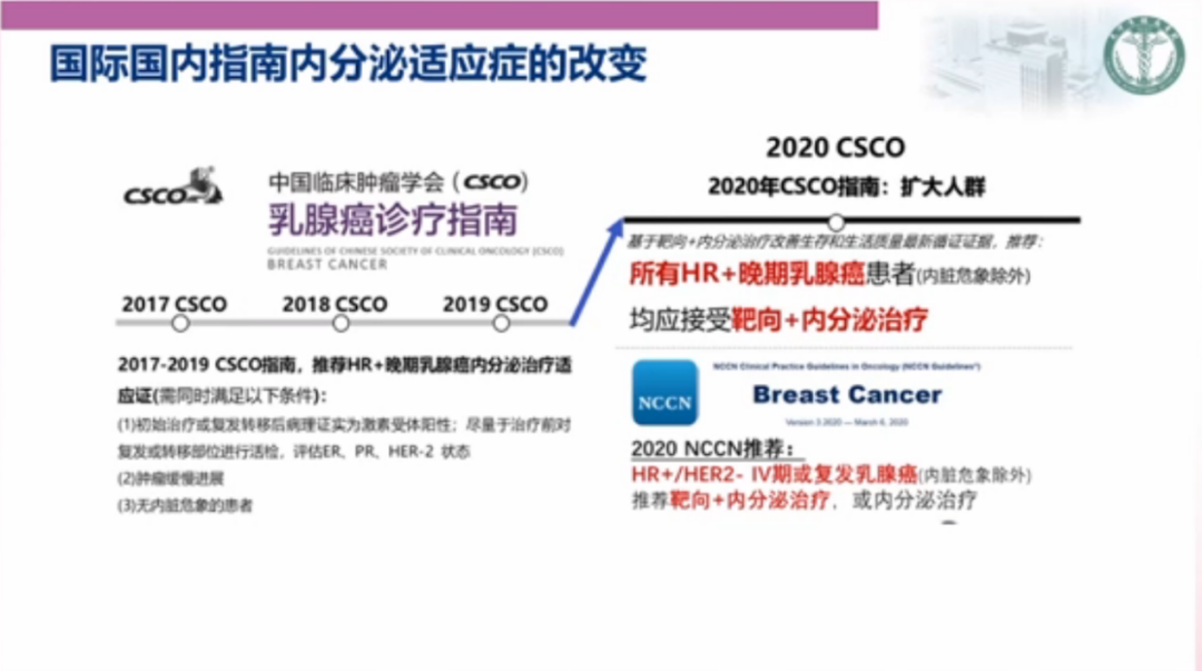 其次,乳腺癌领域重要的治疗指南与专家共识也给予了一致的观点。ABC5明确指出目前尚不能确定gBRCA突变的HR+晚期乳腺癌患者PARP抑制剂和CDK4/6抑制剂联合内分泌治疗的最佳顺序,但是鉴于CDK4/6抑制剂已知的OS获益,90.2%的专家组成员建议其用于PARP抑制剂之前。2020年NCCN指南和CSCO指南在HR+晚期乳腺癌内分泌治疗适应症中,均一致推荐,不存在内脏危象的HR+/HER2-晚期乳腺癌,均可接受靶向联合内分泌治疗。CDK4/6抑制剂靶向治疗扩展和巩固了内分泌治疗的优选地位。