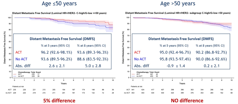 进一步的分析提示在Luminal型乳腺癌辅助化疗豁免的年龄依赖性效应(如Tailor-X)(Piccart等人,SABCS 2019)。96%的患者接受了辅助内分泌治疗,在年龄≤50岁的未接受化疗患者中,最常见的治疗是他莫昔芬单药5年(55%),16%的患者接受OFS治疗(化疗组中有26%),化疗组 vs. 未化疗组的差值是5%。(注:在TAILOR X研究中,绝经前临床高危RS16-20和RS21-25的化疗组与未化疗组相似:分别是6.5%和8.7%)。这种年龄依赖性效应可能是由于化疗引起的卵巢功能抑制所致。