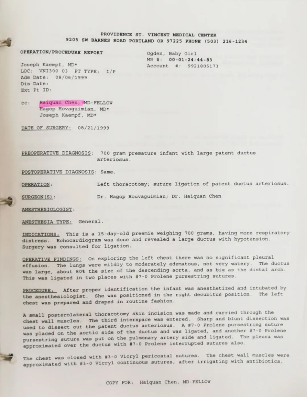 ▲陈海泉在St. Vicent工作期间的手术记录:这是一例仅有700g的低体重女婴,患有大动脉导管未闭,行左侧开胸-动脉导管未闭结扎术