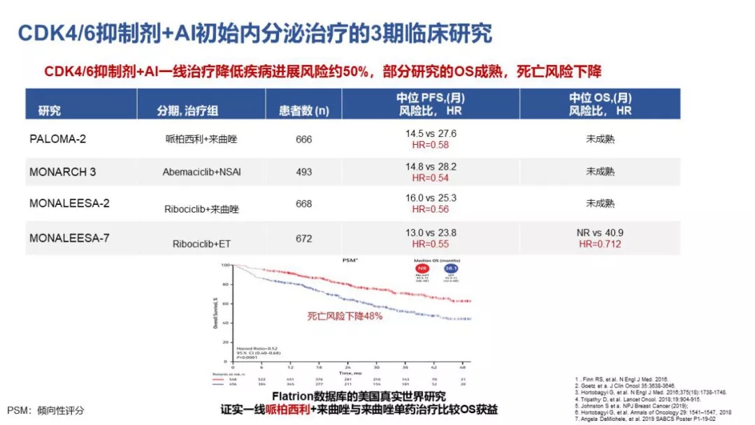 图1. CDK4/6抑制剂联合AI一线治疗晚期乳腺癌降低疾病进展风险约50%