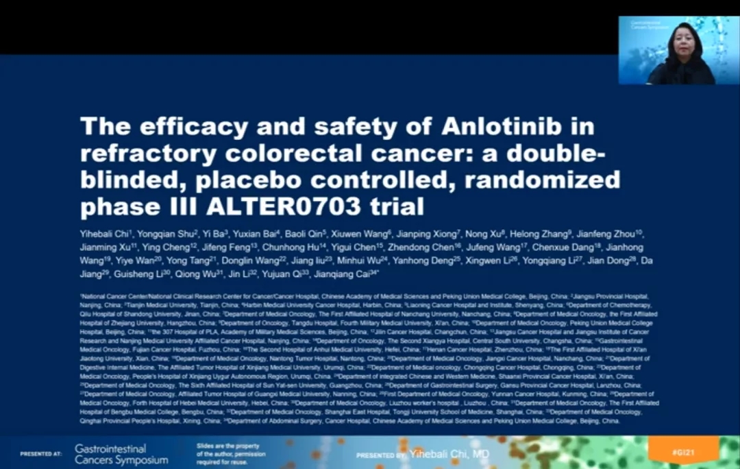 编者按:对于化疗方案失败的转移性结直肠癌,其后线治疗选择有限,一直是肿瘤专家们研究的热点。美国东部标准时间1月15~17日,2021年ASCO GI上,中国医学科学院肿瘤医院依荷芭丽·迟、蔡建强、王金万教授作为PI的Ⅲ期ALTER0703试验揭晓:在中国化疗方案失败的mCRC患者中,安罗替尼可显著延长PFS,且毒性可管理。第一作者依荷芭丽·迟教授在会上报告了该研究结果(ABSTRACT 65)。