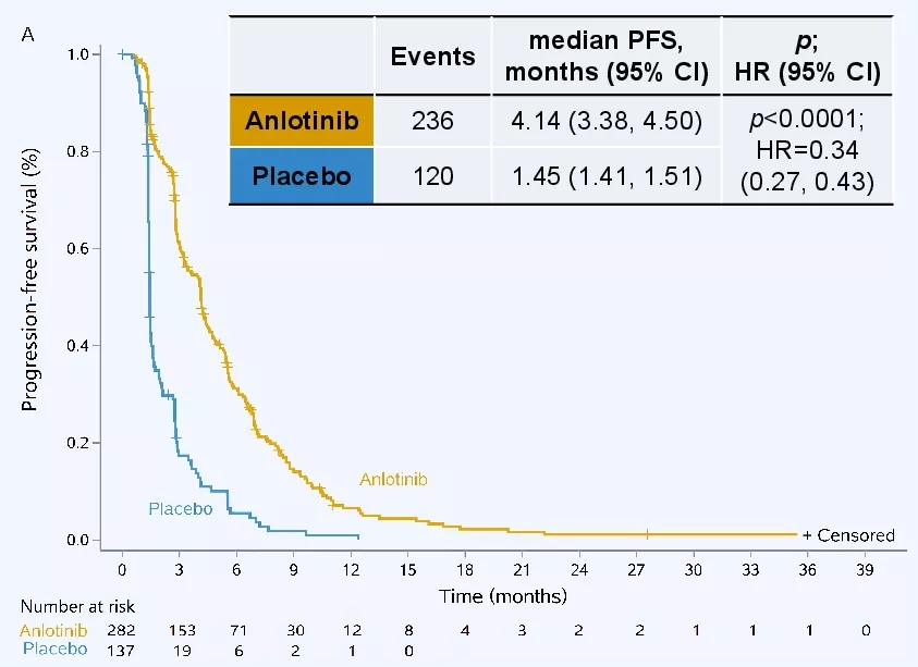 2014年12月至2016年8月期间,共纳入419例患者,其中安罗替尼组282例,安慰剂组137例。截止2018年8月31日的数据显示: