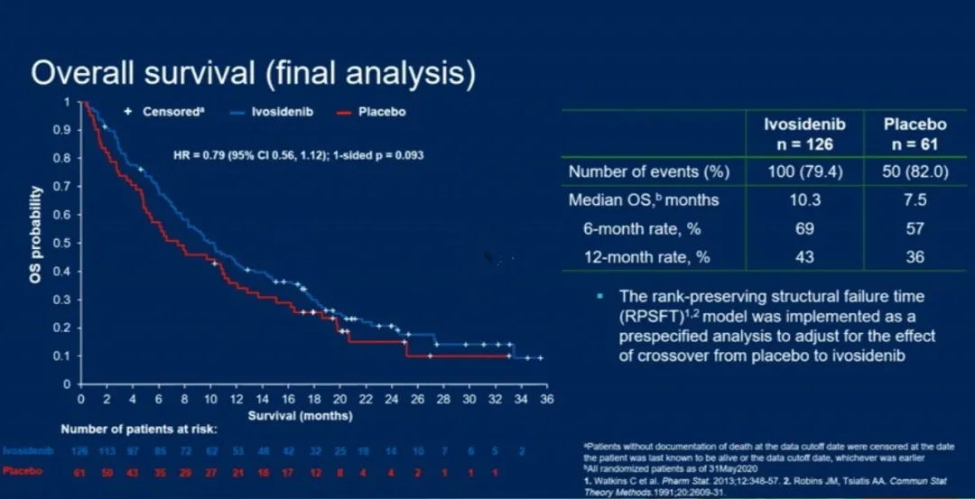 正如研究者评价这项研究一样其局限性有待后期研究解答。虽然接受Ivosidenib的患者的mOS较安慰剂组患者长,但未达到显著差异。这可能部分归因于安慰剂ivosidenib交叉的效果。尽管如此,与经RPSFT调整的安慰剂相比,Ivosidenib在OS方面有显著改善并达到统计学差异。其次是受IDH1突变率的影响,纳入患者的数量受到一定的限制,也说明对于低频突变驱动基因的研究需要全球多中心的研究者协作提供足够的样本量才能产生科学的和可信的临床研究结果。