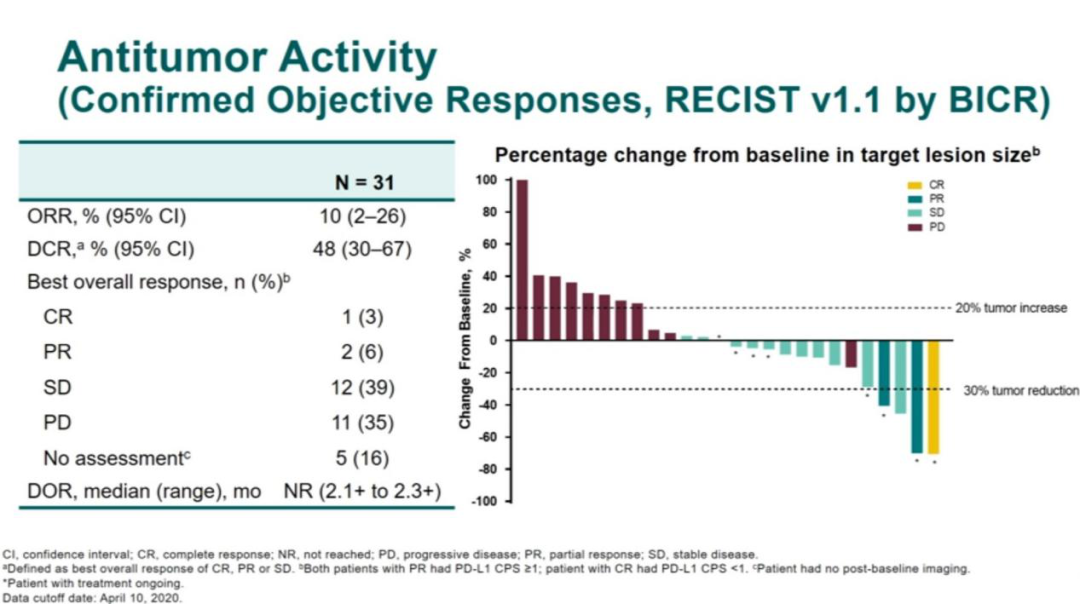 结果:31例患者纳入胃癌队列;87%为男性,58%的患者年龄<65岁,71%为PD-L1联合阳性评分(CPS)=1。从首次给药到数据截止日期(2020年4月10日)的中位时间为7.0个月(范围1.9~11.9);19例(61%)患者停止治疗。ORR为10%(95%CI:2~26);1例CR(3%),2例PR(6%),12例(39%)患者SD。中位DOR未达到(2.1+~2.3+个月)(图2)。DCR为48%(95%CI:30~67)。中位PFS为2.5个月(95%CI:1.8~4.2)。中位OS为5.9个月(95%CI:2.6~8.7)。28例(90%)患者发生与治疗相关的AEs,其中13例(42%)为3~5级AEs。1例患者发生与治疗相关的AE并导致死亡(出血)。8例(26%)患者存在免疫介导的AEs:甲状腺功能减退(n=5)、甲状腺功能亢进(n=2)和肺炎(n=1)。未出现与输液相关的反应。