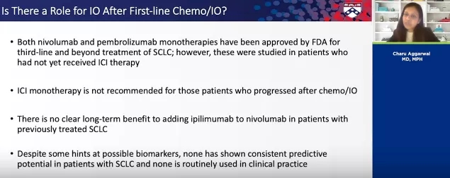美国宾夕法尼亚大学Charu Aggarwal介绍了SCLC免疫化疗后的系统治疗最新进展。免疫疗法+化疗已经被获批用于广泛期小细胞肺癌(ES-SCLC)一线治疗。二线治疗选择化疗方案时,考虑疾病对化疗的敏感性也很重要,临床医生必须考虑哪些患者从化疗中获益最大,何时使用以及使用哪种药物。