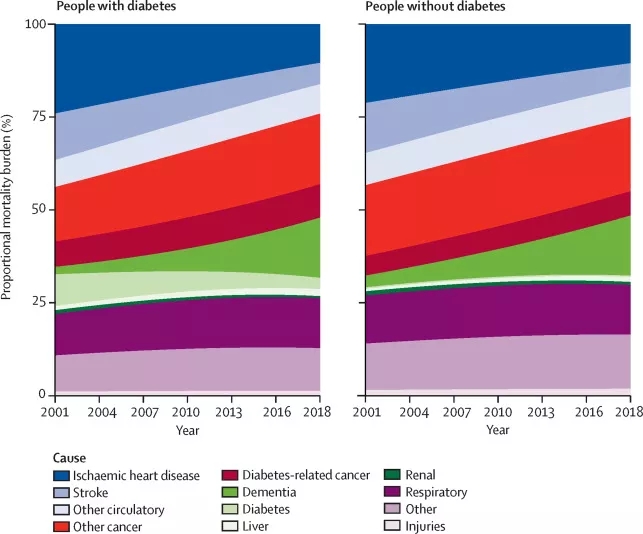 血管疾病死亡率的大幅下降,导致了糖尿病患者死亡的主要原因由血管疾病转变为癌症,并造成了糖尿病患者和非糖尿病患者之间的死亡率差距。