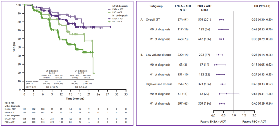 与安慰剂组相比,恩扎卢胺组中初诊M0(NR vs 22.1个月;HR 0.42,95%Cl:0.23~0.76)和初诊M1(NR vs 16.6个月;HR 0.38,95%Cl:0.29~0.50)放射学进展风险均有明显降低,与ITT人群的结果一致;且无论基线时肿瘤负荷高低,恩扎卢胺的获益趋势一致。