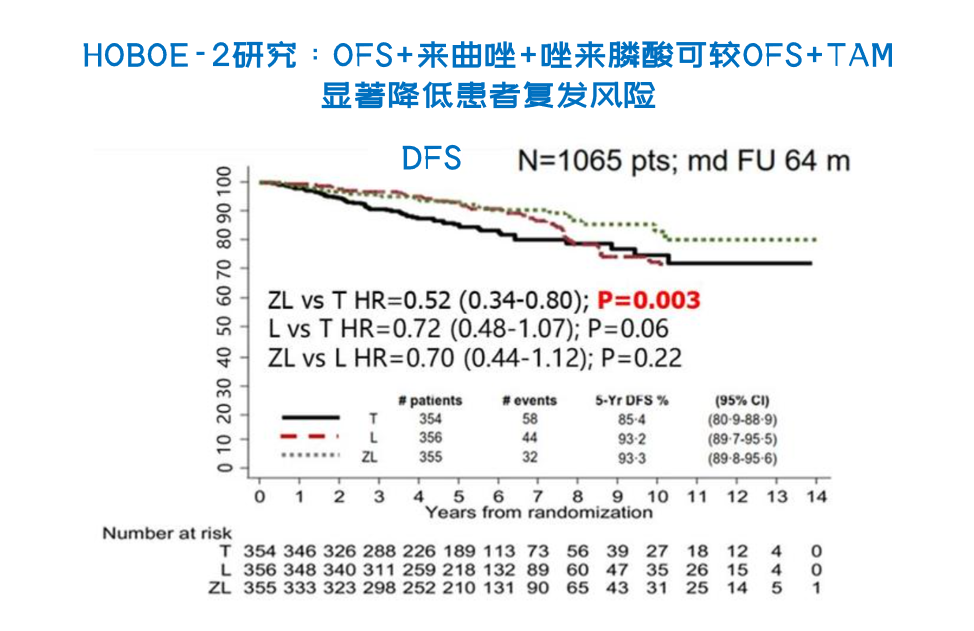 在激素受体阳性的晚期乳腺癌中,研究显示来曲近期的有效率比阿那曲唑组高。理论上,来曲唑对芳香化酶的抑制可能比阿那曲唑更强。但是在激素受体阳性早期乳腺癌的研究中,并没有显示芳香化酶抑制剂之间的显著差异。我也认同HOBOE-2研究的结果。OFS+来曲唑+唑来膦酸较OFS+TAM使DFS的绝对获益达到7.8%,复发风险降低了将近50%。但是由于两组治疗的不对等性,结果只能说明两组疗效存在着显著差异,并不能得出OFS+AI显著优于OFS+TAM的结论。