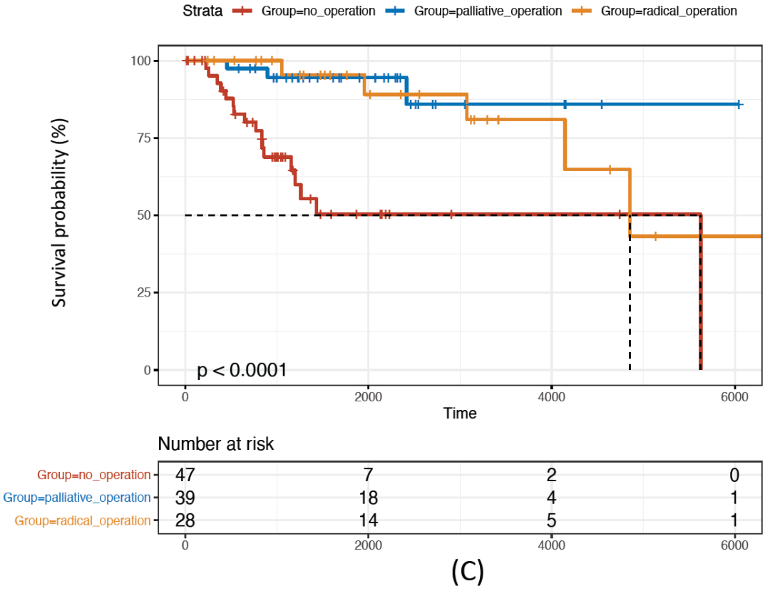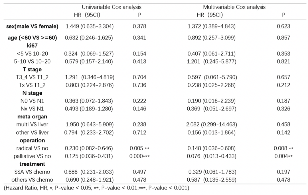 28例患者(24.3%)接受了根治性手术,39例(33.9%)接受了姑息性手术。对于一线治疗,45例患者(39.1%)接受SSA,17例(14.8%)接受化疗,44例(38.2%)接受其他治疗,包括TKI、mTOR等。患者5年生存率为79.36%,10年生存率为70.0%。单因素和多因素COX回归分析均表明,根治性手术(P=0.00528/0.00804)和姑息性手术(P= 0.000976/0.00376)均可提供显著的生存获益,Kaplan-Meier检验结果一致(P<0.0001)。一线SSA治疗有生存获益,需要在更大样本量中进行进一步分析。综上,G2转移性pNET可以从姑息手术中获得生存获益,需要前瞻性临床试验来验证。