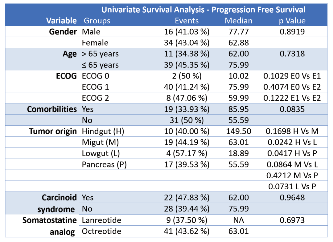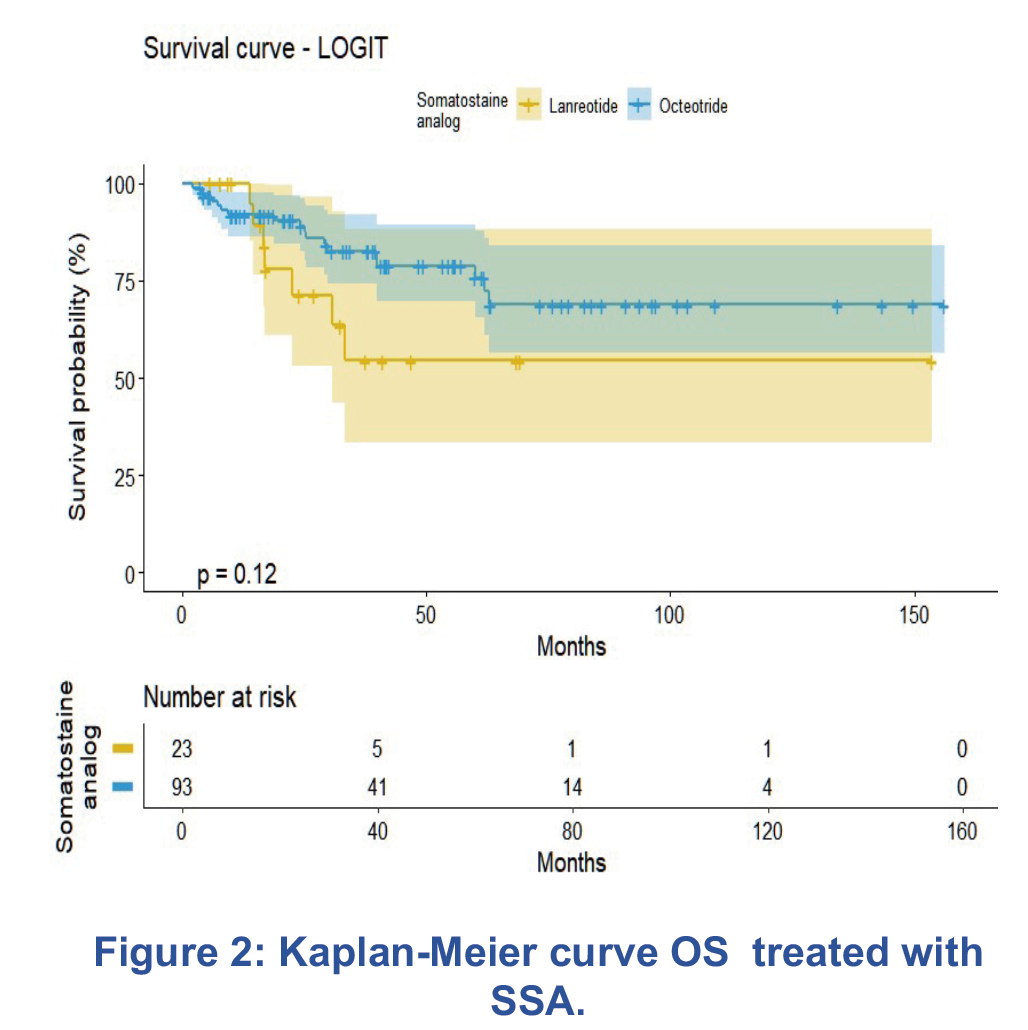 该回顾性研究纳入了120例接受SSA一线治疗(长效奥曲肽和兰瑞肽)的晚期高/中分化的胰腺及肠道NET患者,主要终点为根据RECIST 1.1评价的无进展生存期(PFS),次要终点为临床因素与总生存期之间的相关性。结果显示,120例患者平均年龄56.59 ± 12.59岁,瘤体大小5.97 ± 3.82 cm,起源部位:胰腺35.83%,中肠36.67%,后肠20.83%,其他6.67%。79.50 %的患者使用长效奥曲肽作为一线治疗。所有患者的中位PFS为31.62 个月,其中pNET PFS为24.5 ± 19.5 (3.77 - 97) 个月。奥曲肽组中位OS 117.20个月,兰瑞肽组中位OS 94.60个月,未观察到不同SSA之间OS的差异(P=0.12)。单变量分析未显示不同性别、年龄、临床分期、ECOG体能状态的PFS差异。