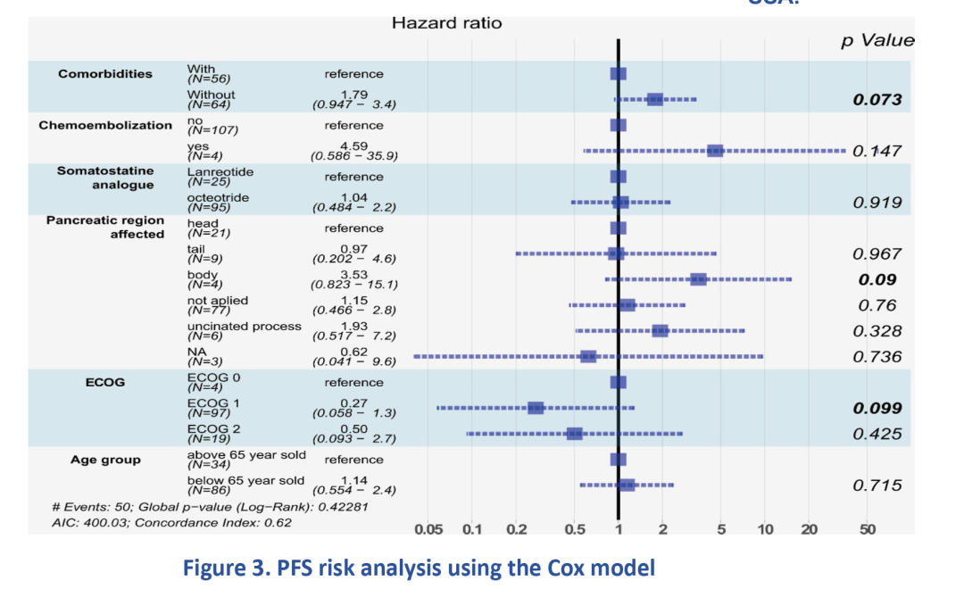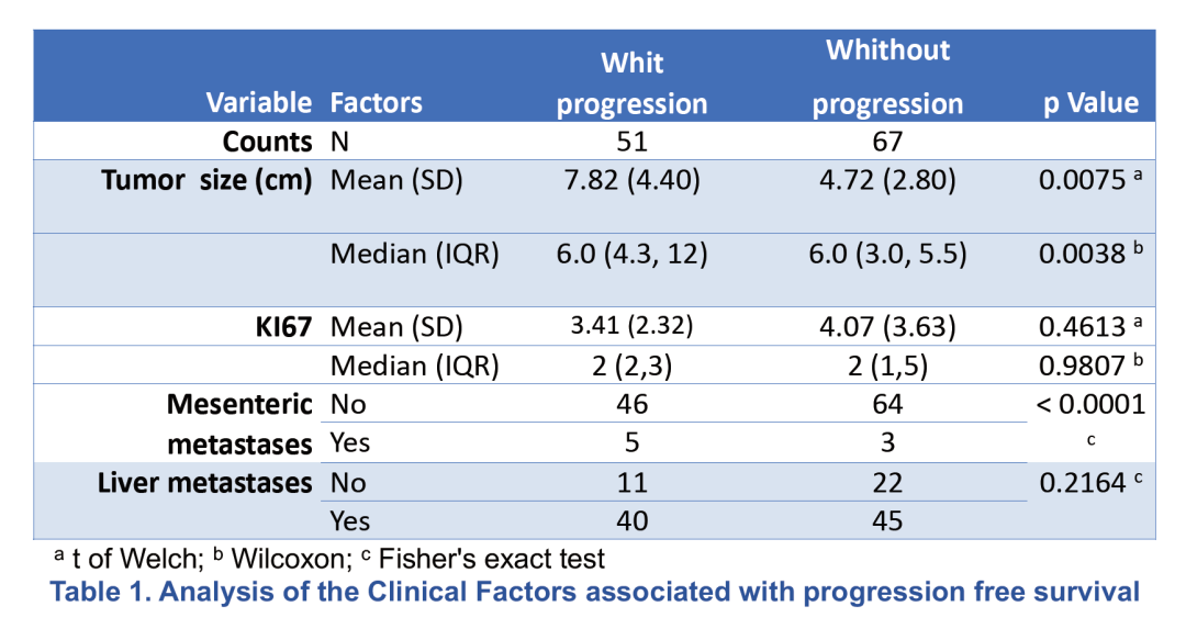 白春梅教授:摘要H15,回顾性探讨了SSA(长效奥曲肽和兰瑞肽)一线治疗晚期胰腺和肠道神经内分泌肿瘤疗效。我们知道,长效奥曲肽Promid研究纳入的是12月内进展的中肠来源的NET患者,对于胰腺和后肠NET,长效奥曲肽作为晚期一线治疗的证据相对有限。而该研究纳入的120例患者中,发病部位胰腺占35.83%,后肠20.83%。约95名使用长效奥曲肽作为一线治疗。所有患者mPFS为31.62 个月,其中pNET mPFS为24.5个月,奥曲肽组中位OS 117.20个月。该研究入组时患者是进展还是稳定未描述,ki67中位数2%,结果再次表明SSA一线治疗高分化神经内分泌瘤患者具有良好疗效。