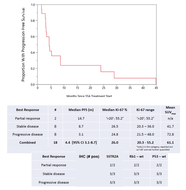 该研究未来分析方向:疾病进展的患者平均SUVmax更高,ki-67指数似乎与PFS、治疗反应性无明显关联;本研究所有肿瘤标本中,P53和RB1均为野生型,与NET高分化基因特征一致;考虑到与细胞毒性化疗相比,SSA具有良好的安全性,可能是一种有吸引力的治疗选择,需要以前瞻性研究进一步探索。