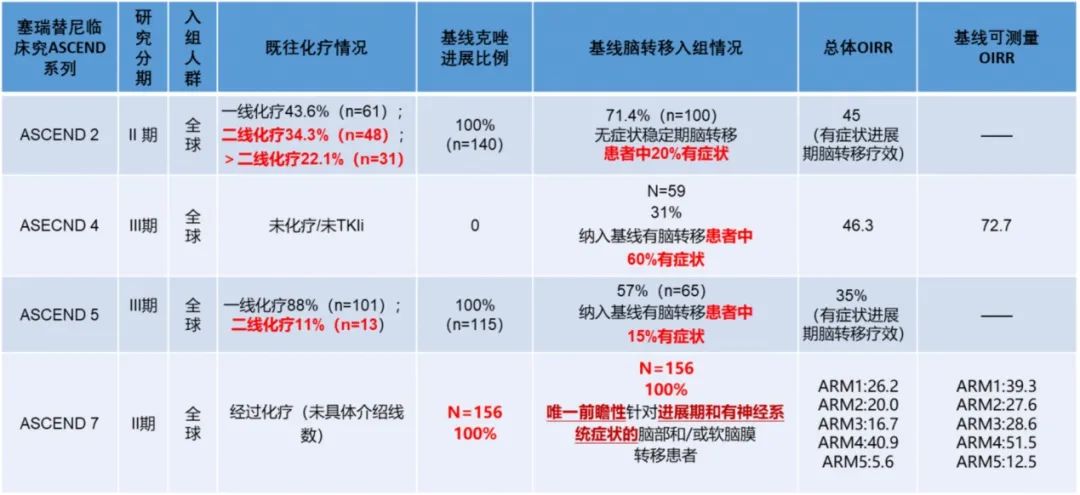 以ASCEND -7研究为例,它是目前唯一一个探索有症状进展期脑转移或脑膜转移的临床研究,共分为5组来探索塞瑞替尼(空腹750 mg/天)疗效和安全性。由于5组研究入组患者基线全然不同,所以将他们作为5个单臂研究的结果来解读。