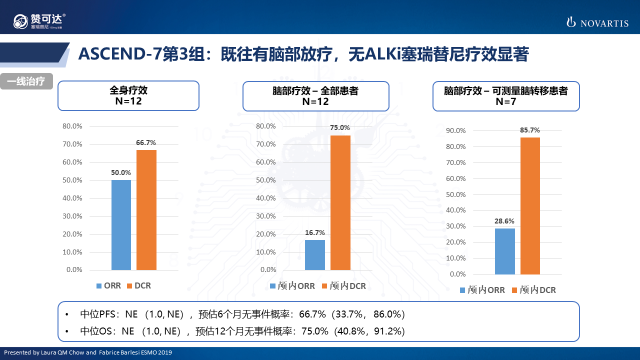 • 第4组:从未使用过ALKi;既往未接受过脑部放疗的患者,这组患者接受塞瑞替尼治疗后全身疾病控制率和客观缓解率分别达到70.5%和59.1%,整个颅内疾病控制率高达75%。