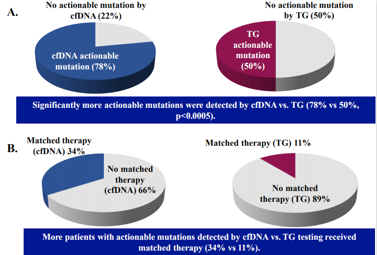 结果显示,252例接受cfDNA检测的患者中,232例(92%)有可检测的突变,196例(78%)有可诉性突变,86例(34%)接受匹配治疗。