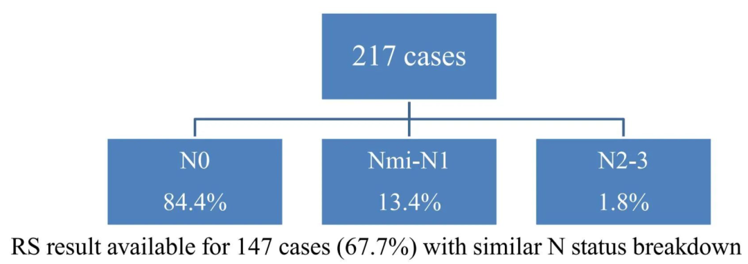 一项单中?回顾性分析研究,入组了2011年11月~2015年12月的绝经后且ER+,HER2-,pT1-2的患者。在纳入的217例患者中,淋巴结状态如下:N0,n=184(85%);Nmi-N1,n=29 (13%);N2-3,n=4(2%)。