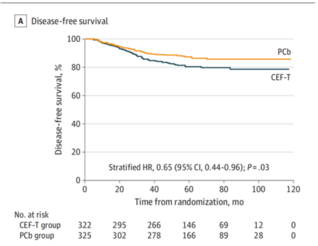 2020年8月13日,余科达教授团队的PATTERN研究于JAMA Oncology杂志发表,探索了卡铂联合紫杉醇(PCb)对比当时指南推荐的CEF-T方案在早期TNBC术后辅助治疗中的价值。与CEF-T方案相比,PCb方案将早期可手术TNBC 5年的DFS提高了6.2%(86.5% vs 80.3%,HR=0.65,95%CI:0.44-0.96,p=0.03),确认了铂类在TNBC辅助治疗中优效性地位。