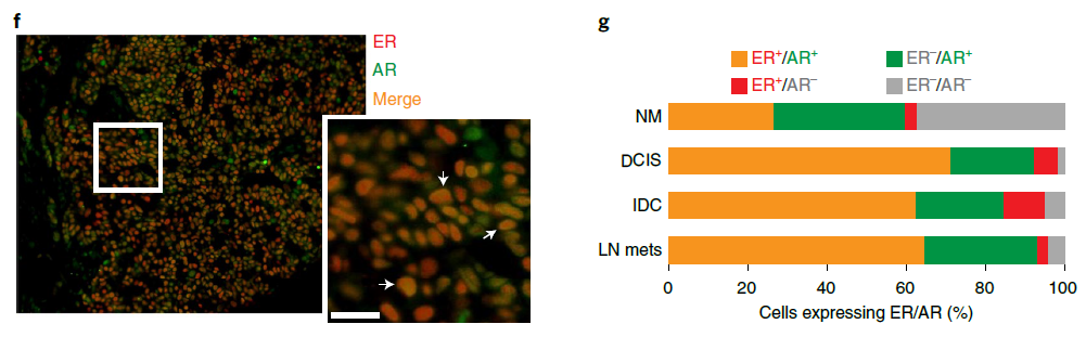 通过组织微阵列(TMA)技术对各类型乳腺癌中ER/AR的表达情况进行量化,该TMA由正常乳腺组织、导管原位癌(DCIS)、浸润性导管癌(IDC)和淋巴结(LN)转移组成。平均而言,约26%的正常乳腺上皮细胞共同表达AR和ER,仅2.7%的细胞单独表达ER。病理性病变中ER+/AR+细胞比例明显增高,60%以上为ER+/AR+,单独表达ER的细胞比例仍很低。该研究结果证实大部分的ER+乳腺癌都会有AR表达,且既往研究显示,AR介导的ER基因组活性的抑制是基于受体的核共定位,因此以AR为靶点治疗ER+乳腺癌是值得进一步探究的。
