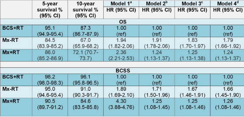 瑞典研究者前瞻性的从瑞典国家登记处收集了2008年~2017年所有被诊断为原发性浸润性乳腺癌女性(T1-2 N0-2)的临床数据、人口和社会经济数据以及合并症。有关局部治疗的完整信息是强制性的,并将这些患者分为三组:保乳手术+放疗组(BCS+RT),乳房切除术后不放疗组(Mx-RT)和乳房切除术后放疗组(Mx+RT)。使用Kaplan-Meier法和逐步调整的Cox回归模型估计总生存率(OS)和乳腺癌特异性生存率(BCSS)。