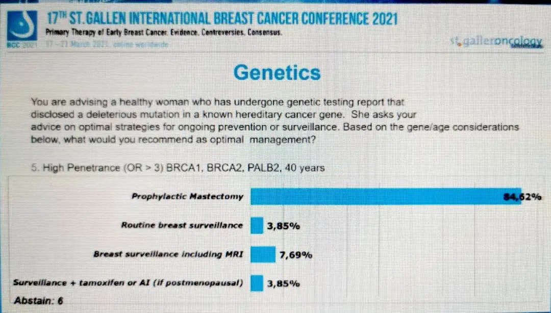 图5:健康女性基因测试报告显示高外显率(OR>3)BRCA1,BRCA2,PALB2突变,年龄40岁,持续预防或监测的最佳策略是什么?84.62%的专家选择“预防性乳房切除”,3.85%的专家选择“常规乳房监测”,7.69%的专家选择“包括MRI在内的乳房监测”,3.85%的专家选择“TAM/AI+监测(如果为绝经后患者)”,6人弃权。