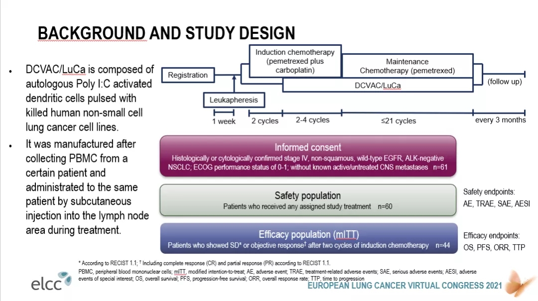 患者正式入组后接受4-6周期诱导化疗[培美曲塞(500mg/m2)+卡铂(AUC=5)],2周期后未进展患者纳入疗效分析的mITT人群,并联合DCVAC/LuCa(剂量与每位患者PBMC单采数量相关,中位数8.48*106个DC)。安全性终点主要为治疗相关不良反应(TRAE)、严重不良反应(SAE)。疗效终点主要为总生存(OS)及无病生存期(PFS).