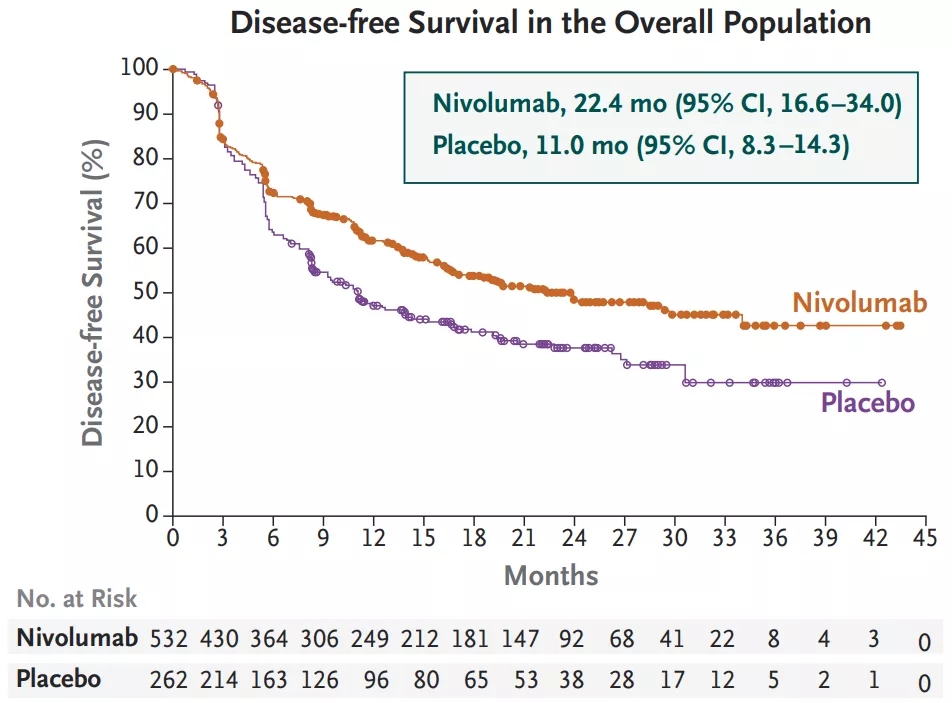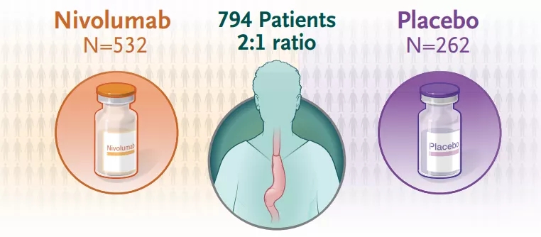 研究人员得出结论认为,在接受新辅助放化疗的食管癌或胃食管交界处癌患者中,接受纳武利尤单抗辅助治疗的患者的DFS明显长于接受安慰剂的患者。