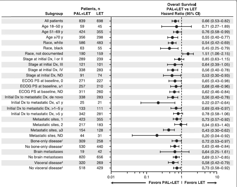 在OS亚组分析中,无论是年轻患者(18~50岁)和年老患者组(51~69岁及≥70岁),无论是否存在内脏转移或仅骨转移患者以及不同ECOG(美国东部肿瘤协作组,Eastern Cooperative Oncology Group)评分患者亚组与LET组相比,哌柏西利+LET在各亚组中都具有OS的优势(图2)。