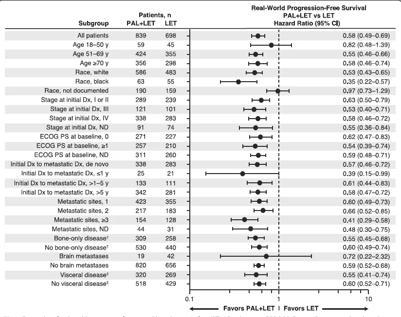 值得注意的是,所有亚组中也均显示出哌柏西利+LET对比LET单药在rwPFS上的一致获益(图4)。