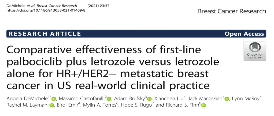 1. DeMichele et al. Comparative effectiveness of first-line palbociclib plus letrozole versus letrozole alone for HR+/HER2 metastatic breast cancer in US real-world clinical practice. Breast Cancer Research (2021). https://doi.org/10.1186/s13058-021-01409-8