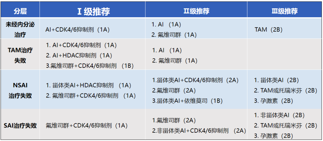 第二,单药内分泌治疗的证据级别有所下调,TAM治疗失败的患者中,AI和氟维司群单药治疗证据级别由1A调整至2A。其原因为随着联合内分泌治疗的高级别循证医学证据的出现,我们看到联合内分泌治疗在PFS、OS的获益优于AI或氟维司群单药内分泌治疗的疗效。虽然单药内分泌治疗在级别推荐上有所下降,但是根据中国临床实践,单药内分泌治疗的专家共识度依然很高。