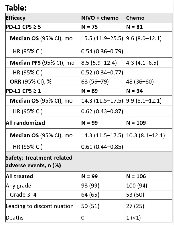 在所有随机人群中,纳武利尤单抗+化疗组的中位OS(HR: 0.61; 95% CI: 0.44-0.85)为14.3个月(95% CI: 11.5–17.5),单独化疗组为10.3 个月(95% CI: 8.1–12.1)。