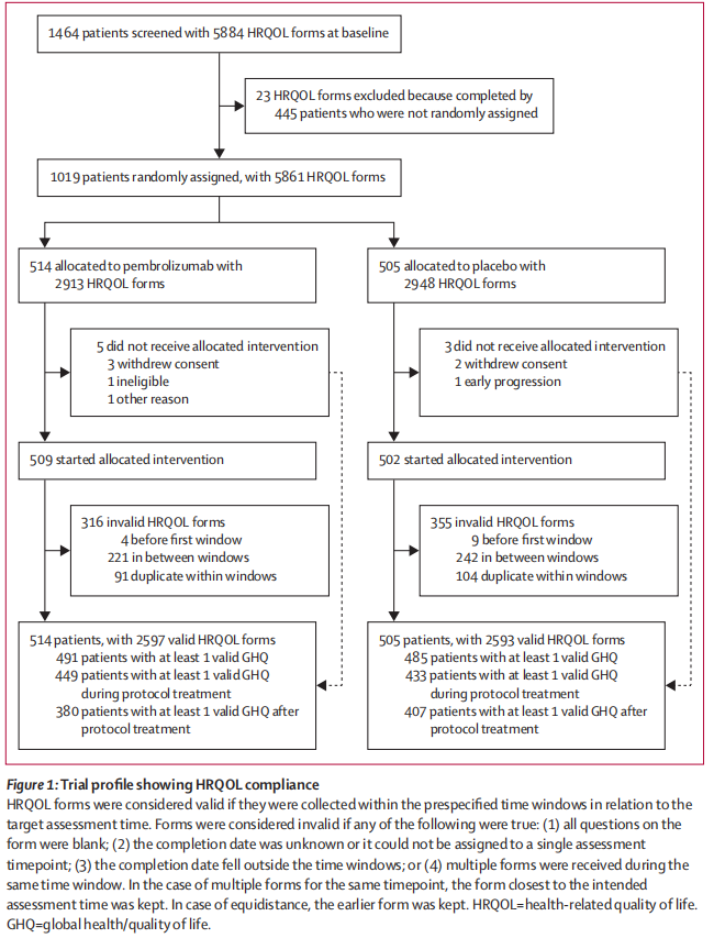 患者被随机分配(1:1)至Pembrolizumab 200 mg组或安慰剂组,每3周静脉给药一次,持续1年,直至疾病复发或出现不可接受的毒性或死亡。根据疾病分期和地区,使用最小化方法对随机化进行分层。研究的主要终点是无复发生存率。HRQOL是一个预先设定的探索性终点,用EORTC QLQ-C30量表测量超过2年的全球健康/生活质量(GHQ)作为主要分析指标,对意向治疗人群进行分析。