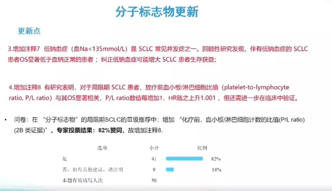 增加注释8:有研究表明,对于局限期SCLC患者,放疗前血小板淋巴细胞比值(P/L ratio)与OS显著相关,P/L ratio数值每增加1,HR随之上升1.001,但还需要进一步在临床中验证。