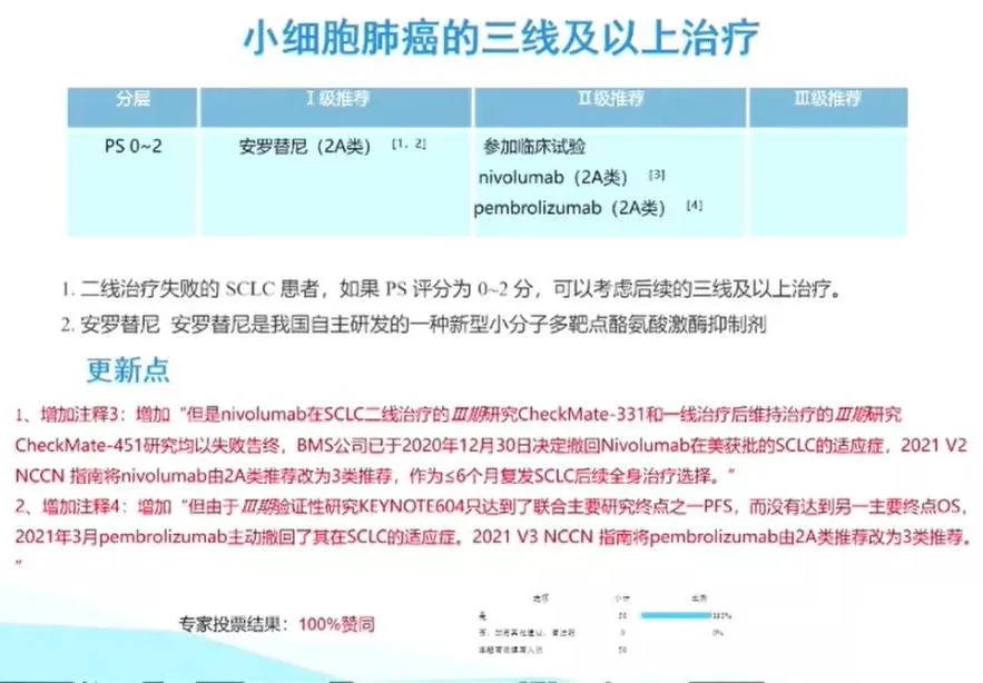 增加注释4:增加“但由于III期验证性研究KEYNOTE-604只达到了联合主要研究终点之一PFS,而没有达到另一主要终点OS,2021年3月pembrolizumab主动撤回了其在SCLC的适应症。2021 V3 NCCN指南将pembrolizumab由2A类推荐改为3类推荐。”