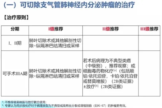 【注释】1、对于I~III期LCNEC患者,手术切除是早期LCNEC的主要治疗手段,但没有证据表明手术方式和术后整体生存率有明显关系。