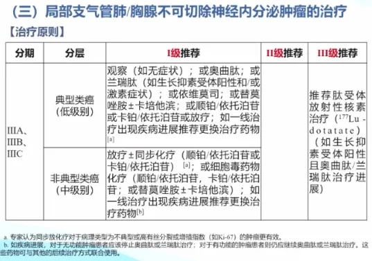 对于局部支气管肺/胸腺不可切除神经内分泌肿瘤,应根据肿瘤是否具有内分泌激素功能,来选择后续是否给予奥曲肽或兰瑞肽治疗;根据肿瘤的不同级别,来选择是否进行含铂方案的化疗。