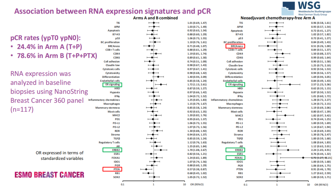 该研究入组了包括cT1-cT4c,cN0-3 HER2+/HR-早期乳腺癌患者,随机分为接受帕妥珠单抗(P)联合曲妥珠(T)(P+T组;n=92)或P+T+紫杉醇组(n=42)。使用NanoString Breast Cancer 360面板(n=117)分析基线(BL)活检中的基因表达特征;分别有119例患者和76例患者的BL和治疗后(第3周)sTIL水平可用。标准化基因表达特征对pCR(odds ratio,OR)和侵袭性无病生存(iDFS)的影响分别用logistic回归和Cox回归估计风险比(HR);并计算了Spearman相关性。