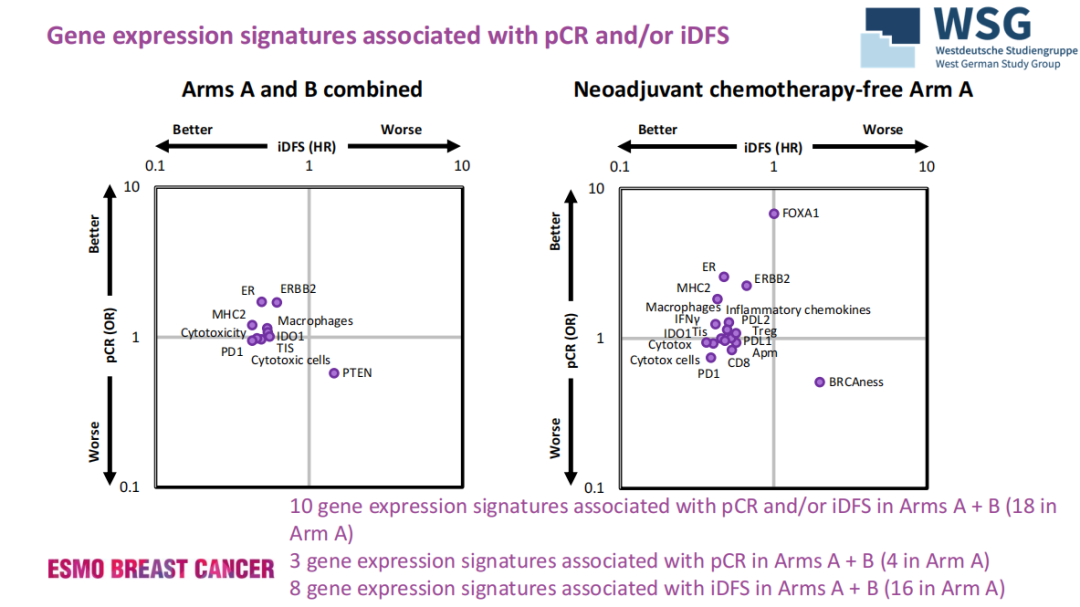 本次ESMO大会公布的转化研究的特色在于将肿瘤看成一个整体,不但对绝大部分入组患者的基因特征做了360基因的panel分析,同时也对其周围的免疫微环境做了相关分析,找到了与pCR及长期生存相关的基因表达特征。