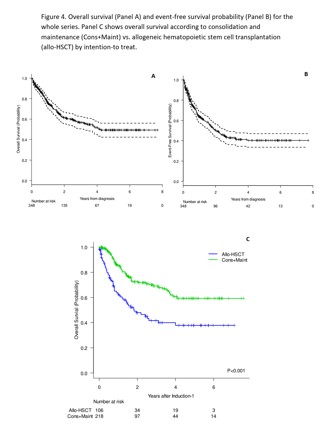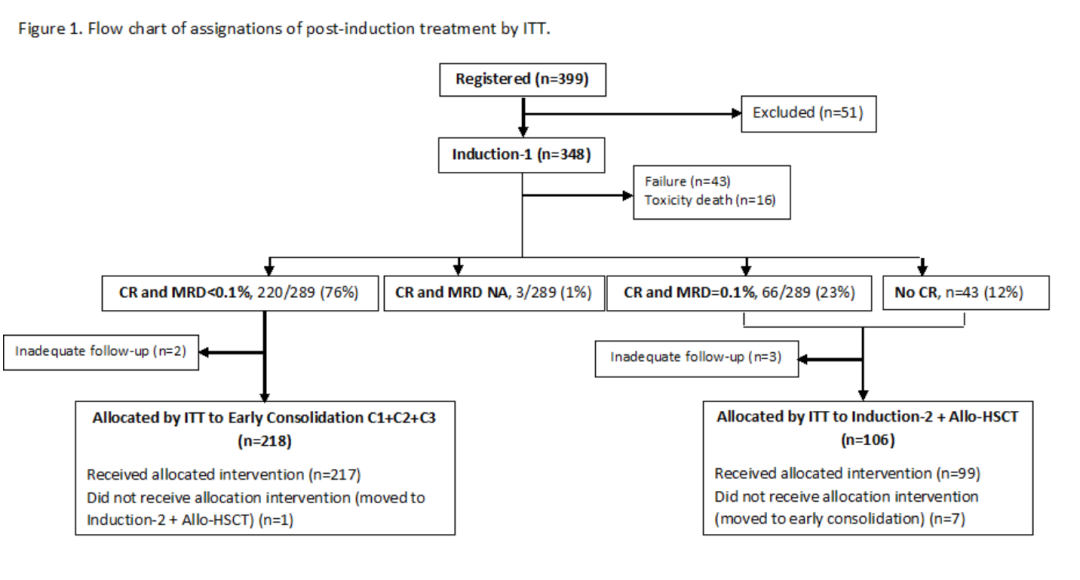 研究从2011年8月到2019年10月共纳入来自西班牙51家医院的348名HR Ph阴性ALL的青少年和成人患者。315/348名患者(91%)达到CR,220/289名患者(76%)诱导后MRD <0.1%。通过意向性治疗,218例患者被分配为化疗组,106例患者被分配为allo-HSCT组。