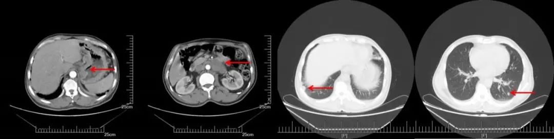 CT(2016-8-22):1、胃体癌并肝胃间、腹膜后多发淋巴结转移,强化均匀,最大横径约17mm。2、双侧膈肌脚后及纵隔内多发淋巴结,部分增大,最大横径约14mm。3、双肺多发小结节,考虑转移。