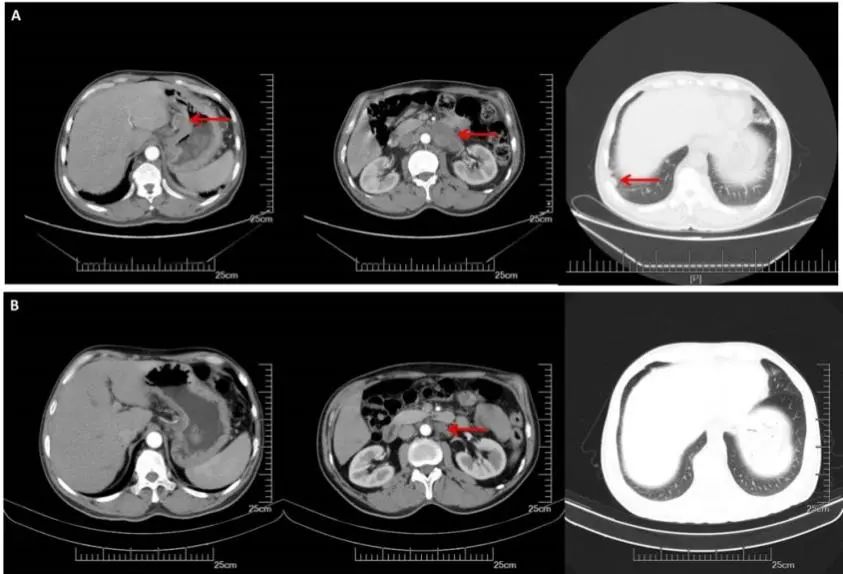 A:CT增强(2016.08.22): 胃体小弯侧增厚,肝胃间、腹膜后多发淋巴结转移,双肺多发转移。B:2周期化疗后CT增强(2016.10.19):胃壁增厚减轻,淋巴结明显缩小,双肺多发转移灶几乎消失