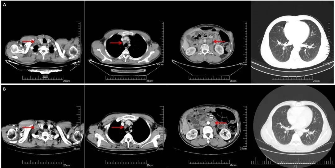 A:CT增强(2017.09.29):右锁骨上,纵膈,腹腔淋巴结明显增大,双肺无明显变化;B:CT增强(2018.03.27):腹膜后多发增大淋巴结较前缩小,右侧锁骨上纵隔内见多发淋巴结,部分较前增大,双肺较前变化不大。