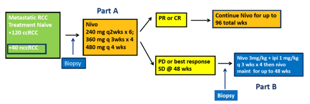 HCRN GU16-260研究探讨了一种新的mRCC免疫治疗模式,即先接受Nivo单药治疗,48周时达到PR/CR的患者继续单药Nivo至96周;PD/SD的患者则替换为Nivo+Ipi双免治疗至96周。