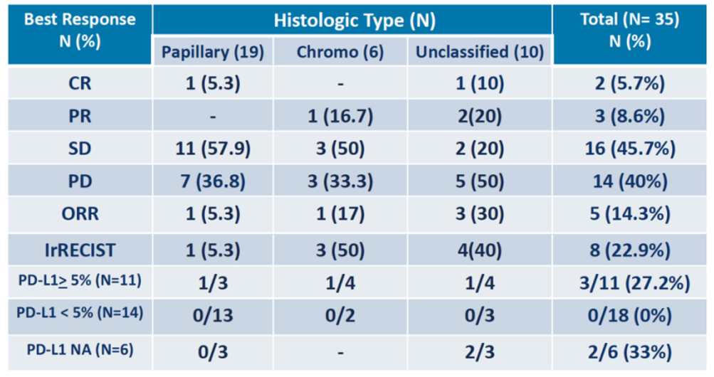研究共入组了35例nccRCC患者,中位年龄63岁,89%为男性;IMDC低、中、高危分占23%、51%、26%;乳头状、嫌色细胞、未分类分占54%、17%、29%。