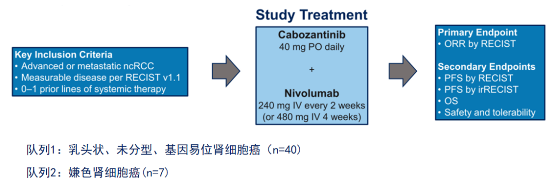 该研究纳入了47例既往0-1线治疗的晚期nccRCC患者,其中队列1为乳头状、未分型、基因易位肾细胞癌(n=40,其中26例既往未经治疗),队列2为嫌色肾细胞癌(n=7)。患者均接受卡博替尼40mg/d联合纳武利尤单抗240mg/2w(或480mg/4w)。